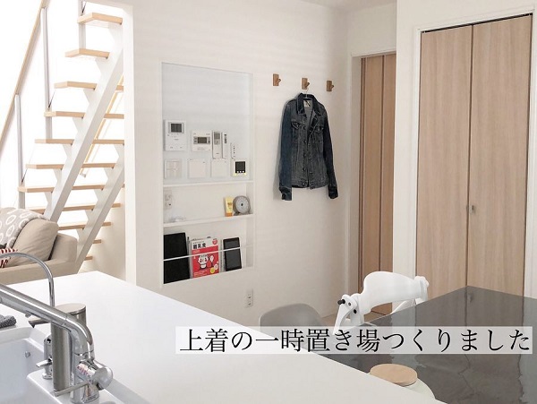 回家时的外套和看了一半的书等,经常带进客厅的东西,要做好“临时住所”以防止乱七八糟。 利用墙壁收纳的话,地面上不会杂乱,也很容易打扫。