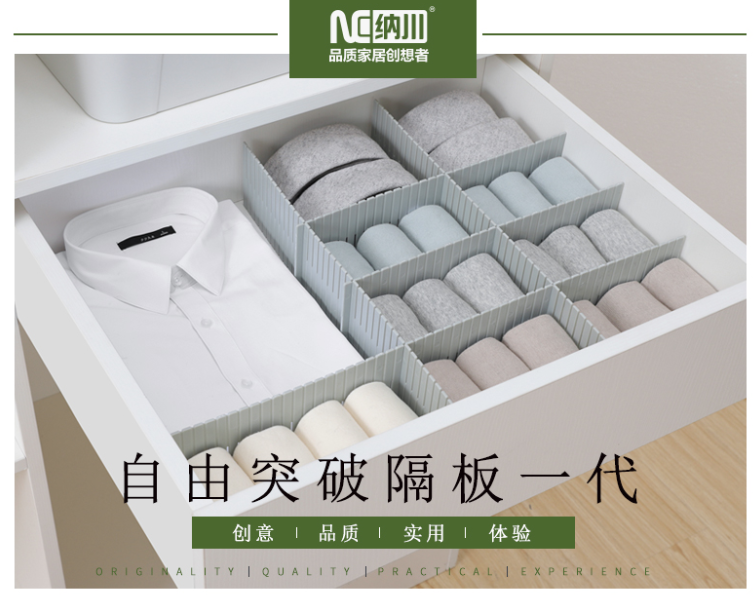 隔板的作用不仅仅是只能用与抽屉,还能用于组成桌面的收纳盒。自由拼接的设计,可任意组成适合物品大小的空间,每个竖槽的宽度是25px,方便判断所需隔板的长度,不需要借助任何工具,轻轻一掰就可以掰断。