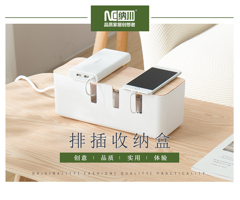 家电越来越多的家里环境,最重要的是家居安全问题,任由电线随意摆放在各个位置,一不留神就容易被绊倒甚至发生漏电的危险,排插收纳盒是预防这一问题产生最实用的小物件。多孔分流的设计,可以有序的规划每一条线路,再加上记号标签,清晰记录标记,不混乱,容量不仅大,还通风透气加快散热。洁白磨砂质地的盒身搭配简约素雅的橡木顶盖,防尘之外给家增添一份情调。