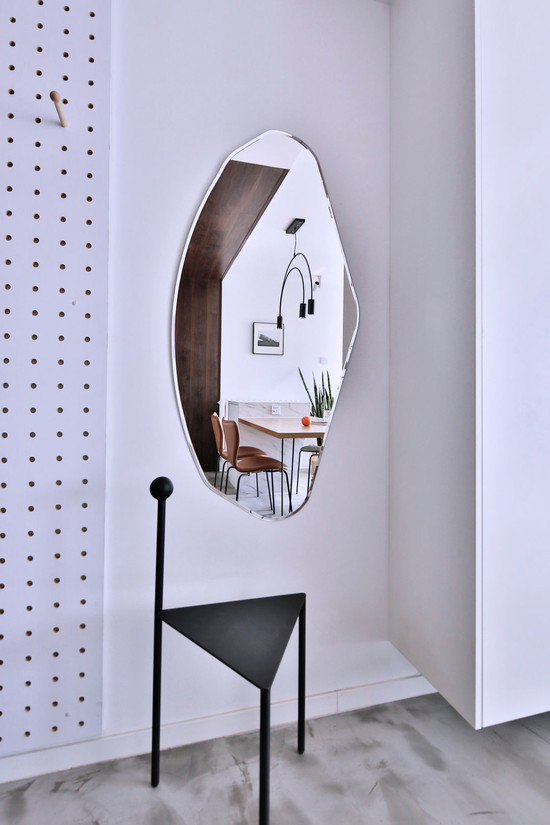 镜子,不单单是整理仪容的工具,还可以成为小户型增大空间的法宝。镜子的镜像和反射特点,会给人增加空间感纵深的错觉,让空间看起来更明亮宽敞。在家里布置一款不规则形状的镜子,小小的镜子反射出家中局部的美景,小中见大,借镜移景,既能增添几分艺术感,又有放大空间的效果。