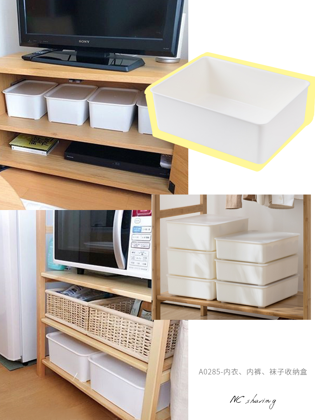 用可叠放的不同规格的收纳盒,分类规整物品,注意选择抽屉式的,方便取物。