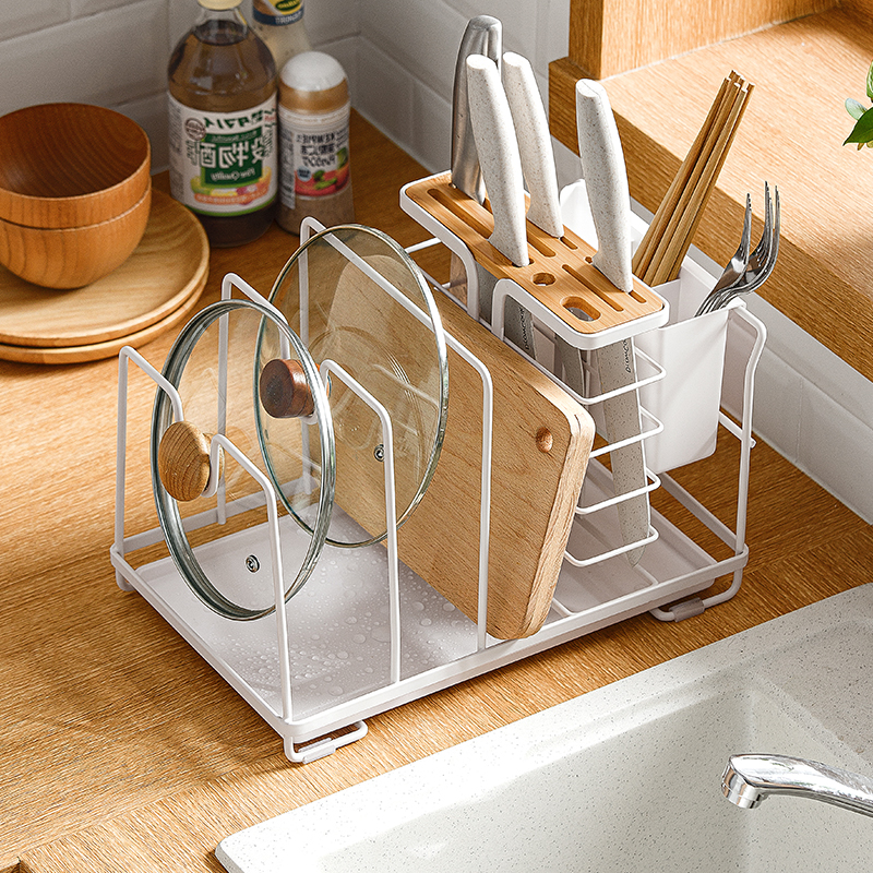 厨房的刀、勺筷、锅盖、菜板等,少了做菜不顺手,多了又带来收纳难题。纳川厨具置物架,多功能设计,可分类收纳刀具、砧板、锅盖、筷勺、抹布等。底部沥水盘便于集水倒水,不易沾湿台面。多规格刀槽,同时收纳多种日常刀具。贴心凹槽可卡住锅盖手柄,放置稳固。可移动筷勺筒,沥水收纳两不误。合理利用空间,厨具收纳整洁有序。