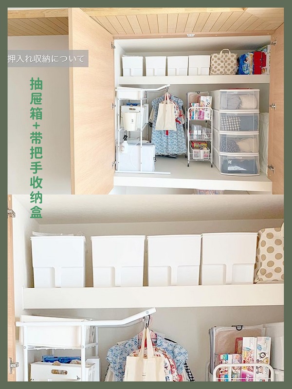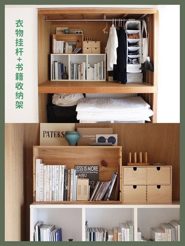 没有专用的书柜的话,在壁橱下层放置收纳箱划分空间,收纳衣物、玩具等杂物;上层除了挂置衣物,下方空间还可以收纳书籍。